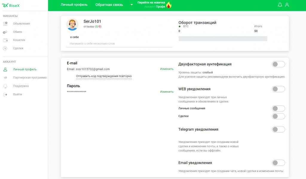 Next, in the Personal Cabinet, we can enable two-factor verification and notifications, change the password, and switch between beginner and pro mode. The difference between these modes is that the profiles get access to all trading features, including the creation of offers.