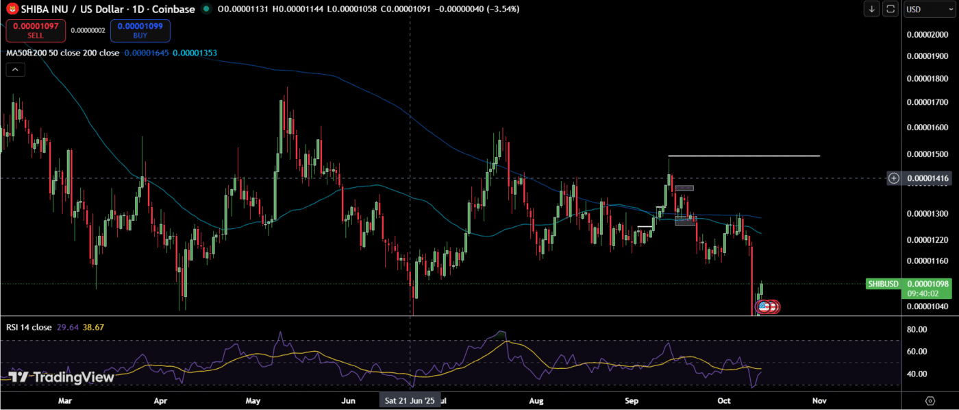 Technical analysis shows that now could be a bad time to be holding Shiba Inu. In the past week, the token broke through its support level at 0.000011, ending expectations of a positive bounce off that failed support level. Currently, the token is tracing back upwards, but analysts don’t expect that the meme token has enough momentum to reverse its current bearish outlook.