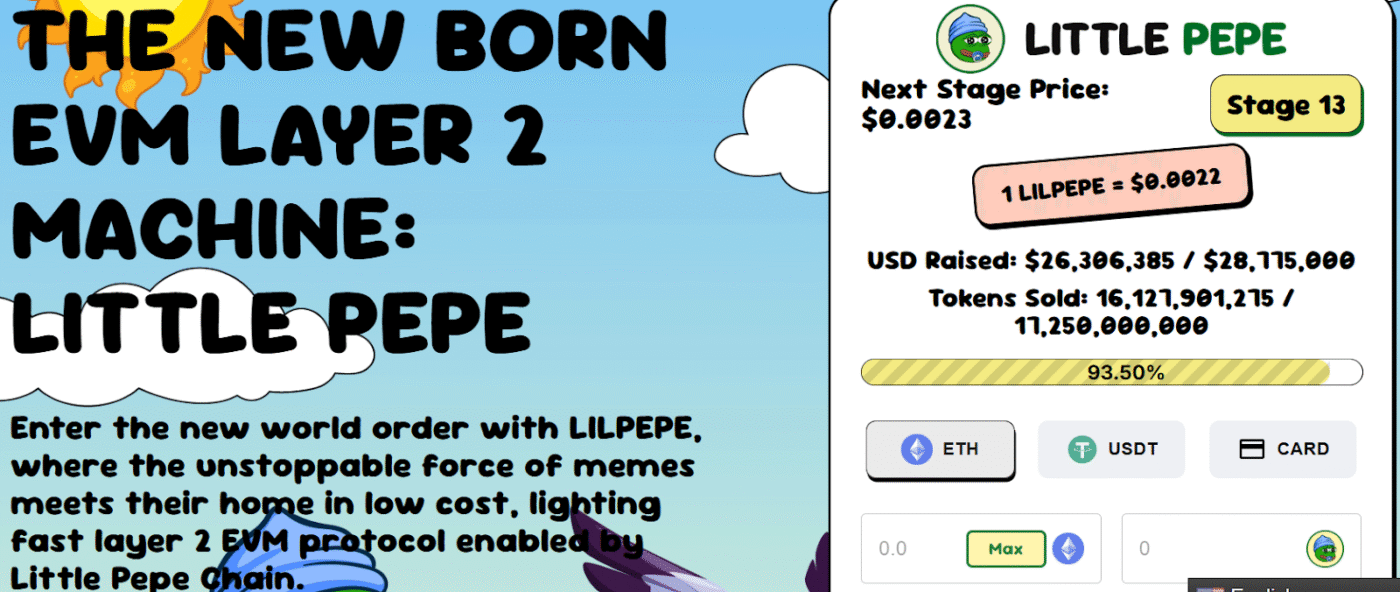 While Shiba Inu’s potential increase is noteworthy, the coin Little Pepe ($LILPEPE) is gaining a lot of attention as it approaches a 24077% breakout. Little Pepe is a meme coin on Layer-2 that combines the viral characteristics of memes with real utility. The token is based on a low-cost, fast, and scalable Layer-2 Ethereum Virtual Machine (EVM) protocol that provides transaction efficiency, which sets it apart from other meme coins. At the time of writing, the LILPEPE token is in Stage 13 of its presale, with the price per token set at $0.0022. The amount raised in the presale is $26,306,385, with 16,127,901,275 tokens sold and less than 1.5 tokens left. The cost of $LILPEPE will rise to $0.00223 in the next stage, which shows the high demand for such a project.