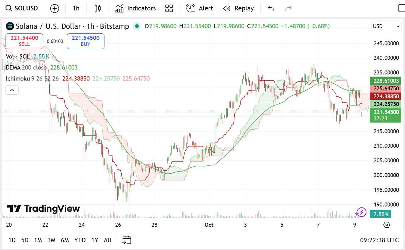Solana, however, remains one of the busiest Layer 1 chains. Its token is trading at $220.66, 0.79% lower on the day, with a market capitalization of $120.65 billion and 24-hour volume at $7.54 billion, 16.39% lower.