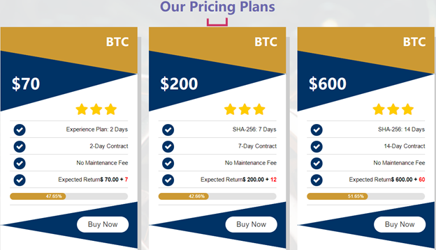 The cloud mining platform offers some of the most affordable pricing plans that ensure users can begin mining without a huge capital. With as low as $70 you can purchase a mining plan that offers a 2-day contract with no maintenance fee and expected returns of up to 10% on investment.