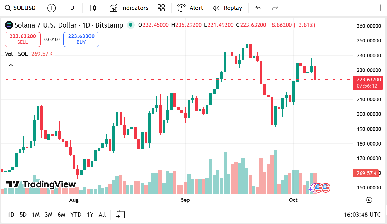 Solana currently trades around $223.63, down by 0.76% in the past day, with a market cap of $126.27 billion and a trading volume of $7.72 billion, up 29.5%. Despite minor fluctuations, the network’s strong developer activity and efficiency continue to draw investor confidence.