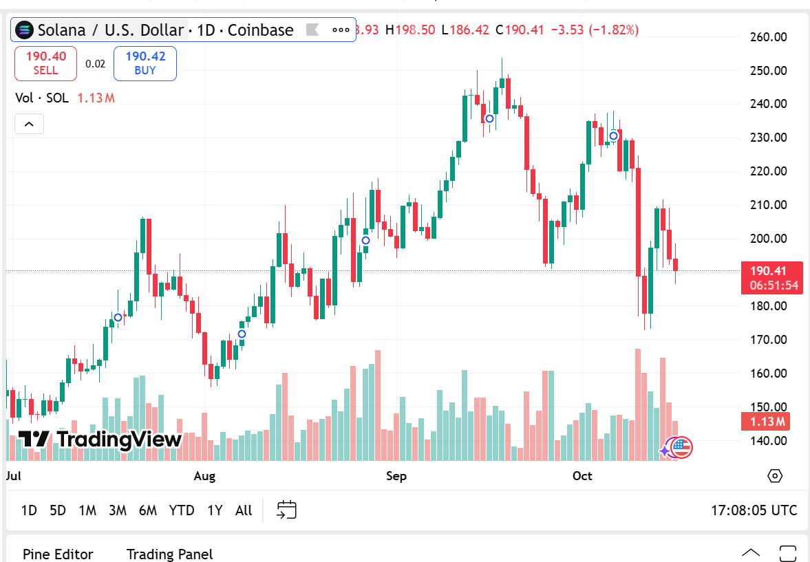 Solana is worth $190.40 right now, which is 2.86% less than it was 24 hours ago. It has a market cap of $107.81 billion and a volume of $9.58 billion, which is an 11.25% drop. Solana is a Layer 1 blockchain asset that is popular because it has low gas fees, quick transactions, and a growing group of developers.