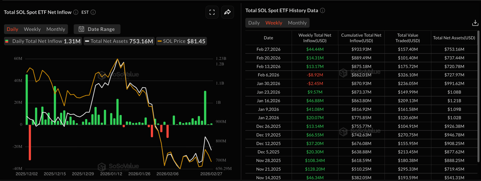 - Spot Solana ETFs in the United States attracted more than $44 million in weekly capital, pushing total inflows beyond $900 million