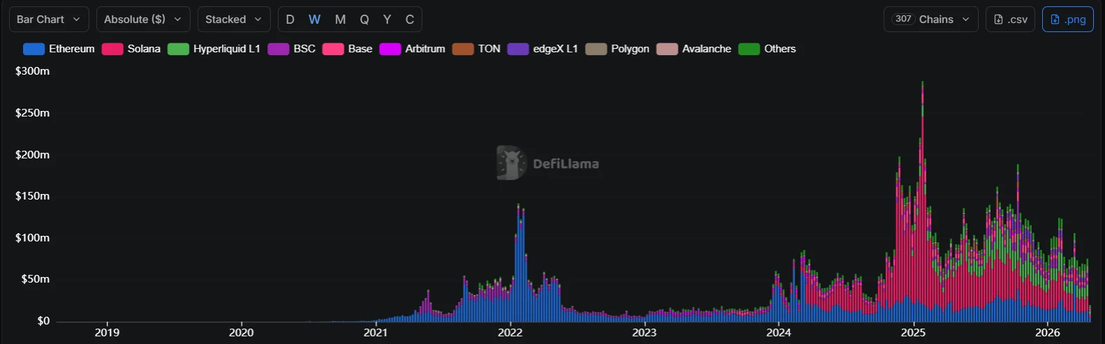 Hyperliquid L1 secured second position with $14.18 million, while Ethereum captured third place at $13.55 million. Additional networks in the rankings include Polygon with $7.58 million, Base at $4.28 million, BNB Chain at $4.15 million, Arbitrum generating $1.62 million, and TON producing $1.37 million.