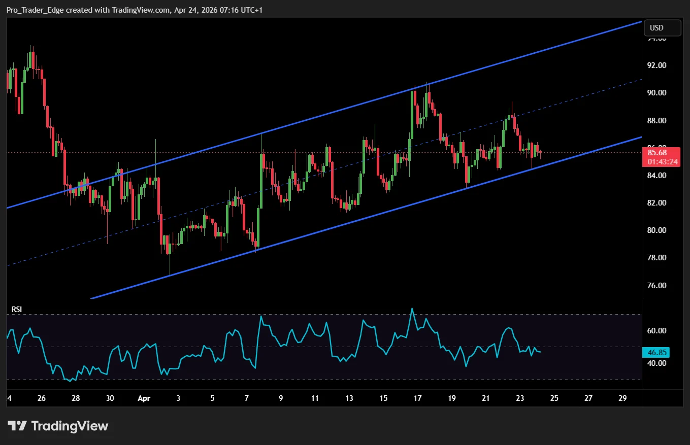 The lower boundary of the 2-hour channel at $83–$84 coincides with the daily 20-day EMA, establishing this zone as the most critical support region to monitor heading into April 24.