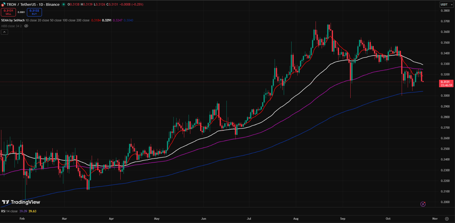 The result is structural pressure. TRON remains a general-purpose layer-1 with impressive throughput, yet the fee advantage is no longer a one-horse race. Trading below $0.32 and at risk of losing the 200-day moving average at $0.30, the situation looks sticky for bulls.