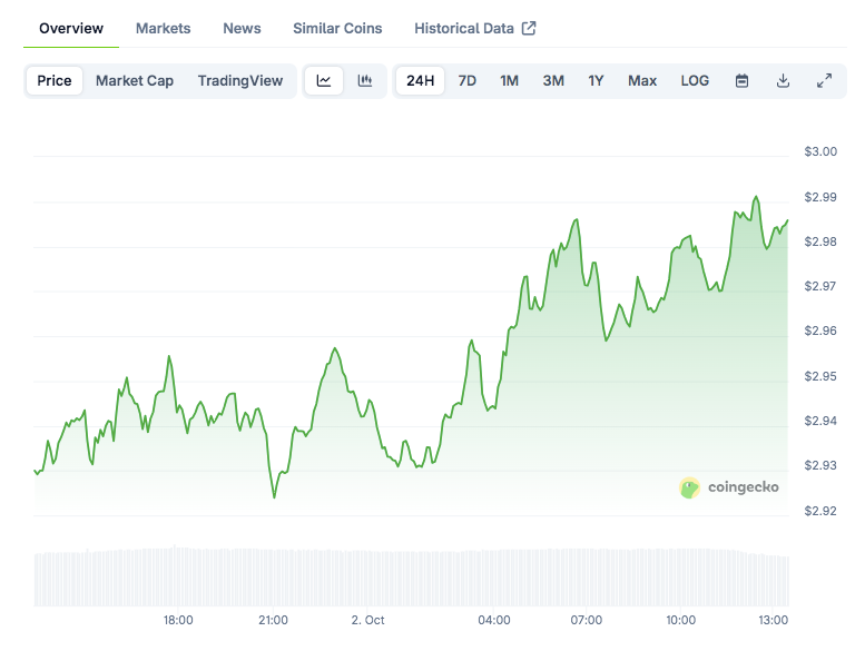 At press time, XRP price hovers just below $3 at $2.98. The Ripple token has surged by 1.81% in the last 24 hours and 5.51% over the past week. The daily trading volume is above $5.5 billion.