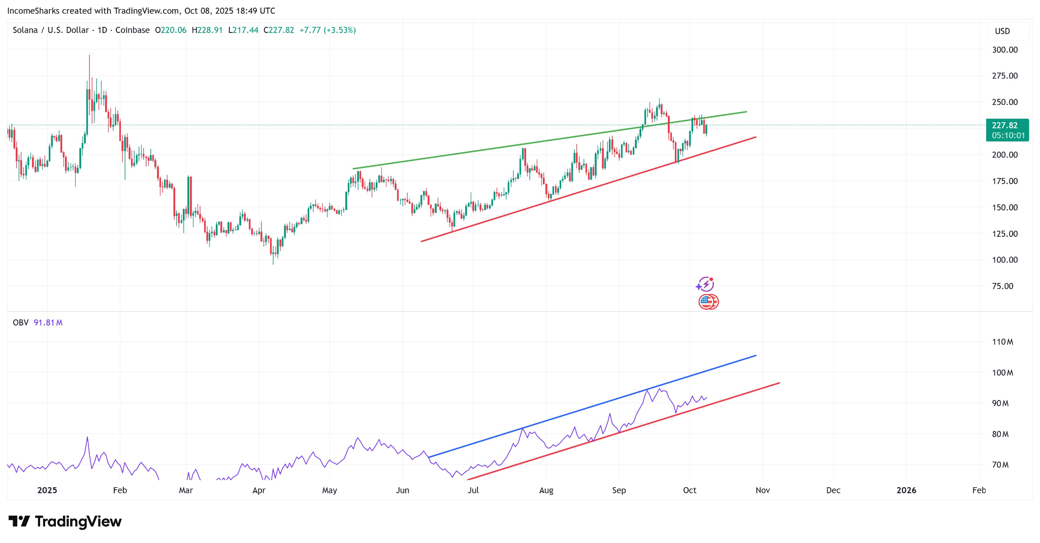 In the chart, Solana remains comfortably inside its ascending channel, with the red line acting as support and the green line marking resistance. The OBV (On-Balance Volume) indicator at the bottom continues to trend higher—an early sign of buying pressure still outweighing selling.