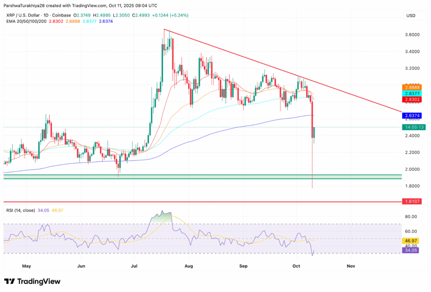XRP news reports of the crash yesterday exposed how vulnerable even high-profile cryptos are to forced liquidations. XRP dropped from ~$2.82 to a floor at $1.64, before recovering to the mid $2s, with futures open interest collapsing by $150 million in that brutal session.