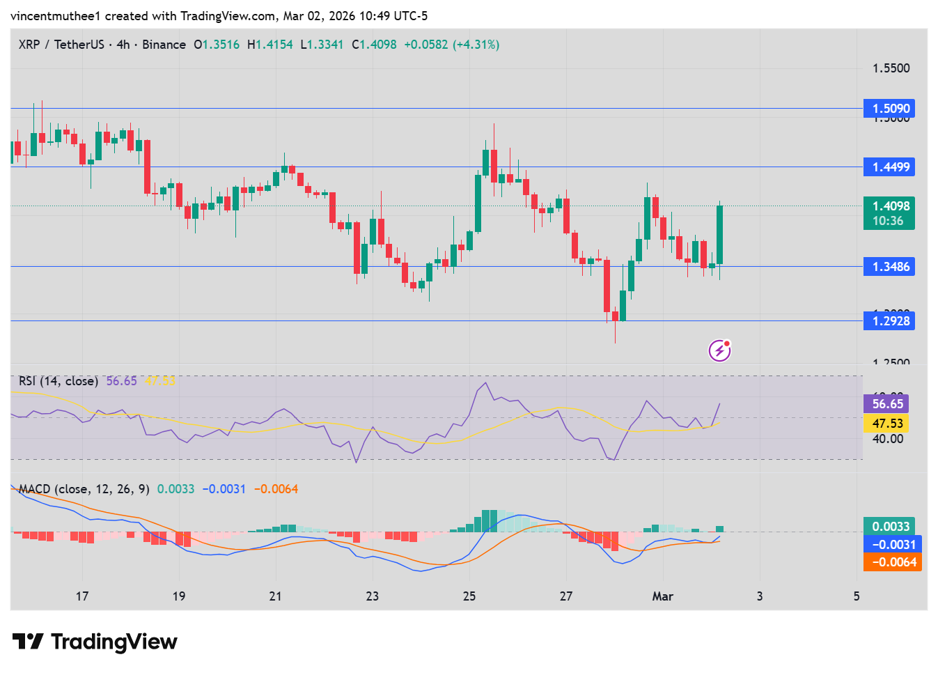 XRP’s technical indicators, including the RSI and MACD, also support a bullish outlook for XRP as they show rising bullish momentum. In case the crypto edges higher, resistance could be faced around $1.4499, with support now at $1.3486.