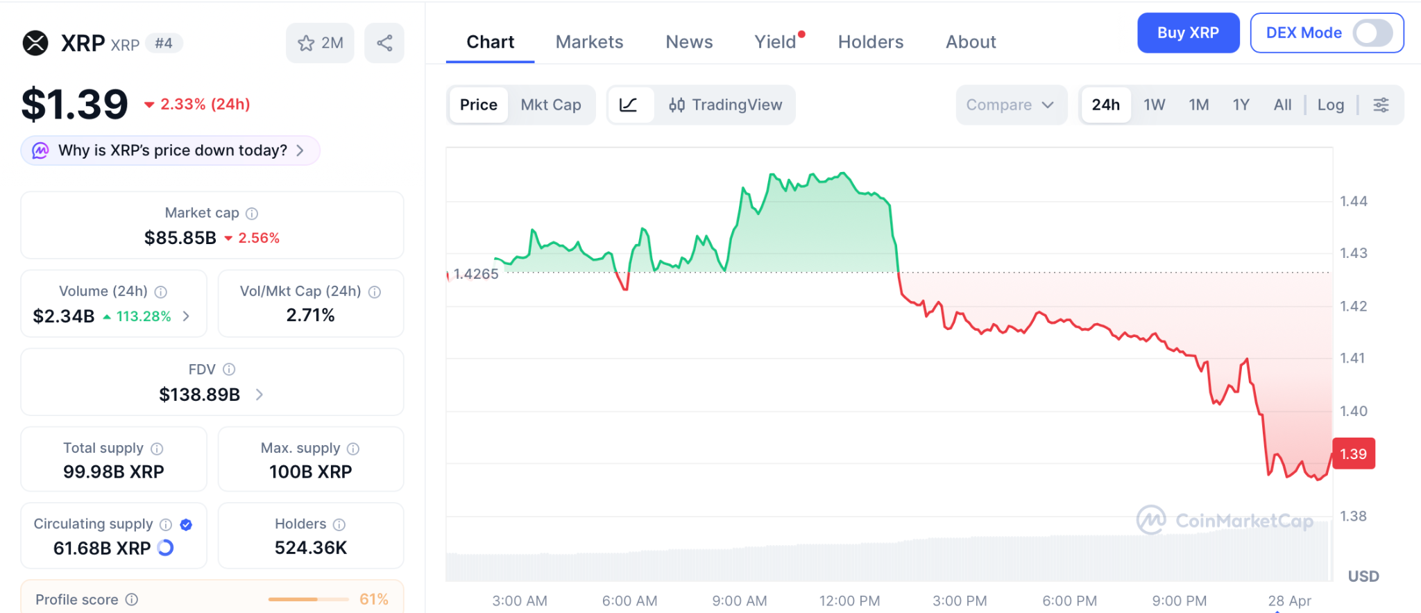 Ripple (XRP) trades near $1.39 as of April 27, consolidating inside a symmetrical triangle after recovering from $1.16 lows earlier this year, according to CoinMarketCap. Ali Martinez identified a breakout pattern and projects a push toward $1.58, according to TheStreet.