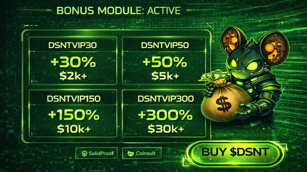 But only those who take advantage of the bonuses mentioned (30% code: DSNTVIP30, 50% code: DSNTVIP50, 150% code: DSNTVIP150, 300% code: DSNTVIP300) by buying now in the presale will enjoy exponential returns.