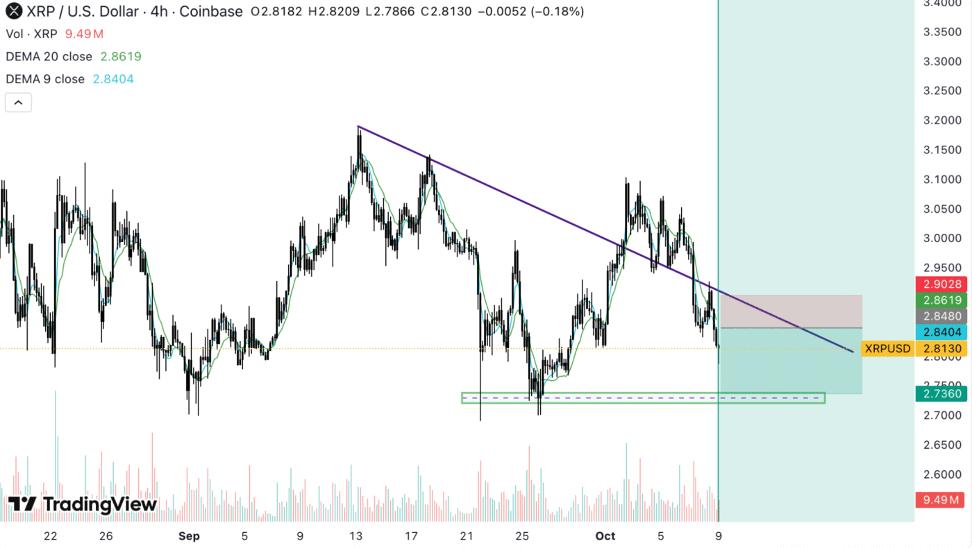 However, the market indicators reflect short-term precaution. The XRP price is near $2.82 with strong support between $2.7 and $2.73. Any upside exceeding $3.10 would be a hint towards a bullish extension, but analysts have observed that low volume is an indication of strong bearishness. Although long-term predictions are still positive, some analysts are projecting that by 2026, the price will hit $10.