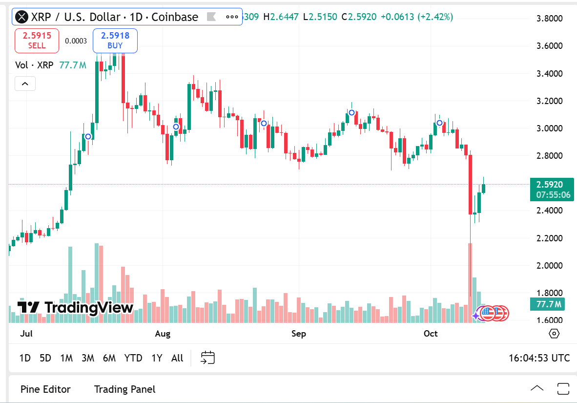 XRP is trading at $2.59, up 7.19% over the last 24 hours, with a market capitalization of $154.85 billion and volume of $10.72 billion, an increase of 40.32%. This follows a recovery in the total crypto market to $4 trillion after a precipitous selloff on Friday by geopolitical instability and technical errors at exchanges.