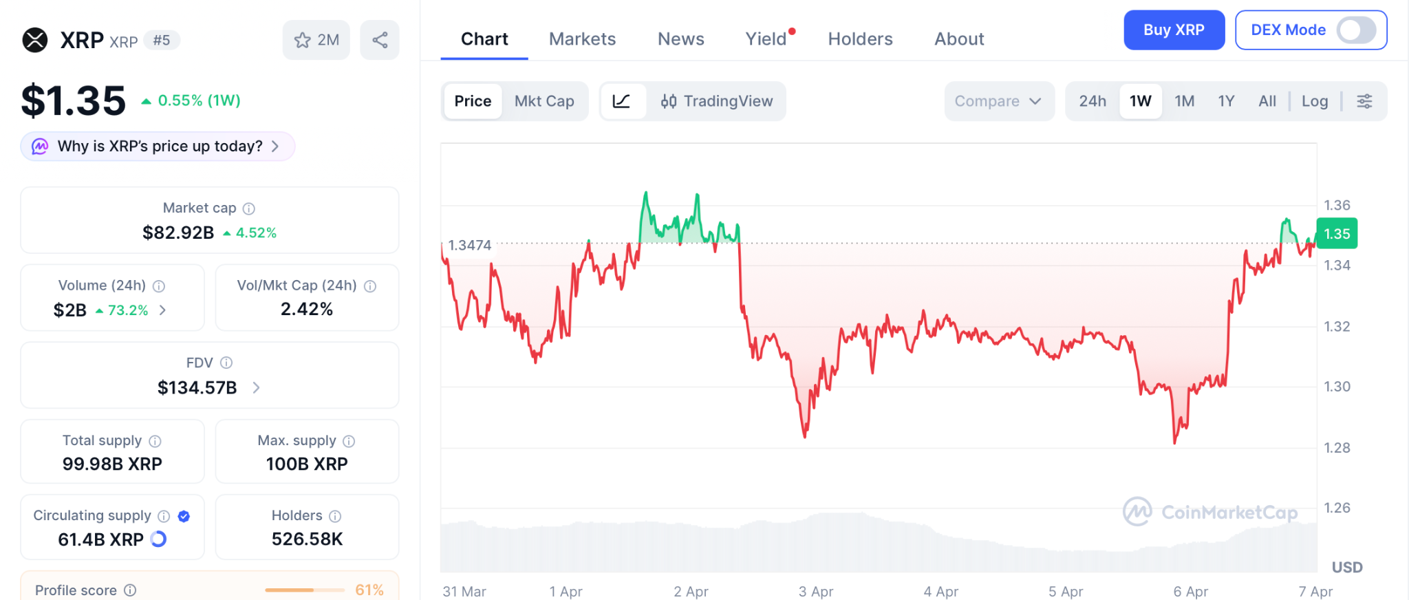 XRP trades at $1.35 on April 6, sitting 64% under its $3.65 peak even after the SEC commodity tag and a new Mastercard partnership according to CoinMarketCap.