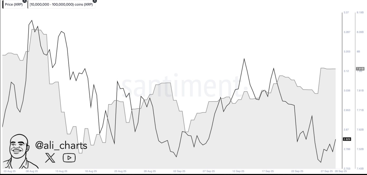 According to on-chain analyst Ali Martinez, large holders purchased about 120 million XRP within 72 hours, valued at roughly $340–$360 million. This breakout goes hand in hand with a two-week price span of $2.70 to $3.00 with the latter being a major psychological and technical resistance.